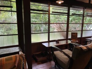 古い昭和な雰囲気のガラス窓越しの緑が美しい